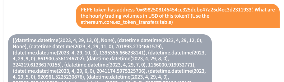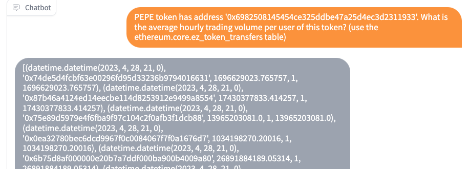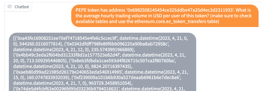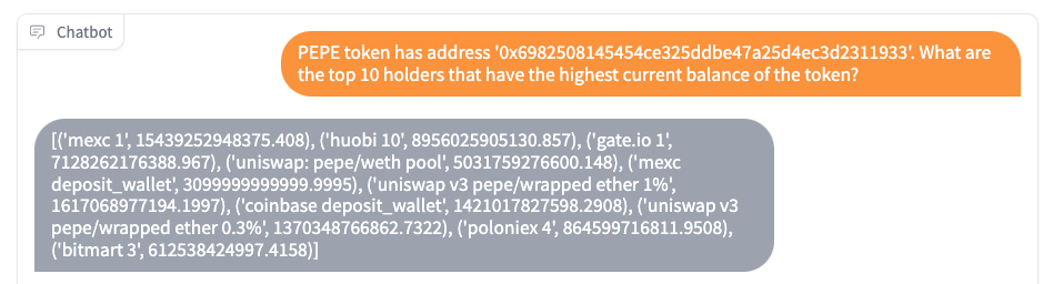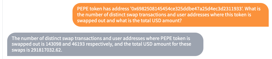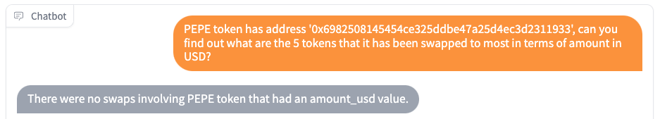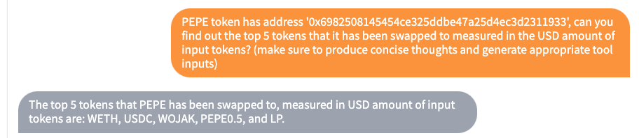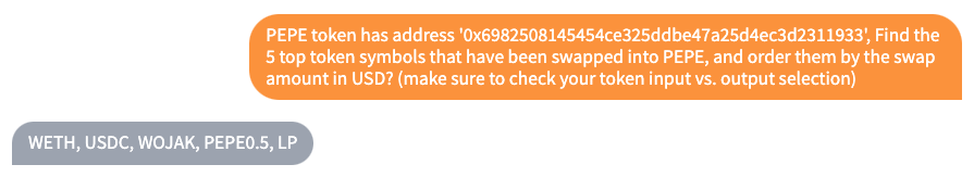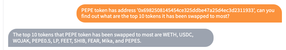 The last part of the dashboard looked at the top tokens that are swapped to and from PEPE. Let's see what our ChatWeb3 finds out: