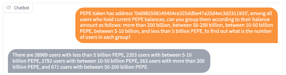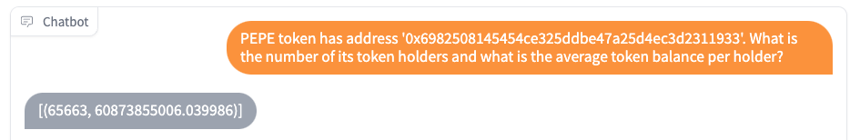 The analysis begins by determining the number of wallet addresses holding the PEPE token and the average number of tokens per address. We posed the following question to the chatbot:
