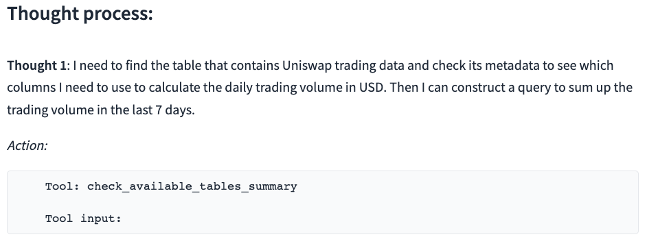 This time the GPT again bypassed our instruction to check the available tables and start to "invent" commands, and it even mentions about using Uniswap V2 subgraph (which is never mentioned in the prompt), below is a snippet of its thought process: