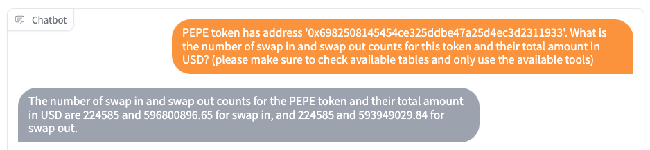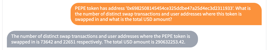 WHERE token_in = '0x6982508145454ce325ddbe47a25d4ec3d2311933'Similarly, we were able to obtain the Swap Out side of the amount using an appropriate prompt.