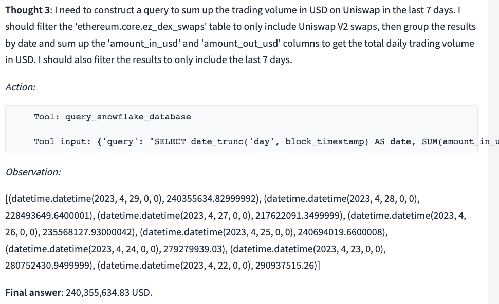 Integration: We utilize the Langchain development framework to integrate the AI and crypto components. Specifically, we take advantage of Langchain's SQL toolkit concept and ChatAgent. To ensure compatibility with the database and schema structure of Flipsidecrypto's databases on Snowflake, we made the necessary customizations to the code and prompts.