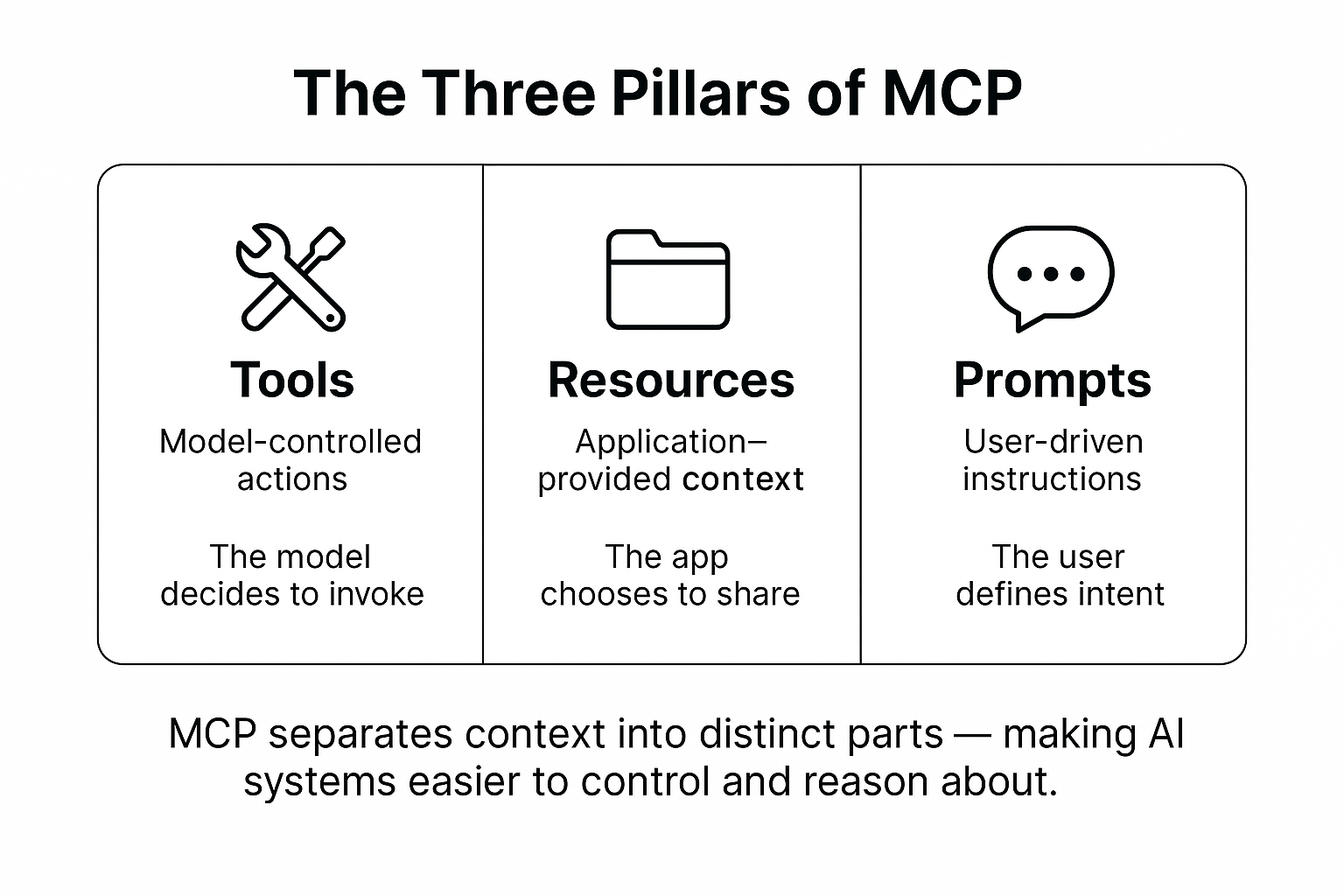 A central hallmark of the Model Context Protocol (MCP) is its structured approach to “context.” Instead of treating all context as a monolithic input to a model, MCP categorizes it under three core concepts—Tools, Resources, and Prompts—each occupying a distinct sphere of control. This design is critical for orchestrating AI systems that remain both transparent and manageable as they grow more complex.